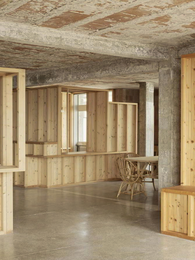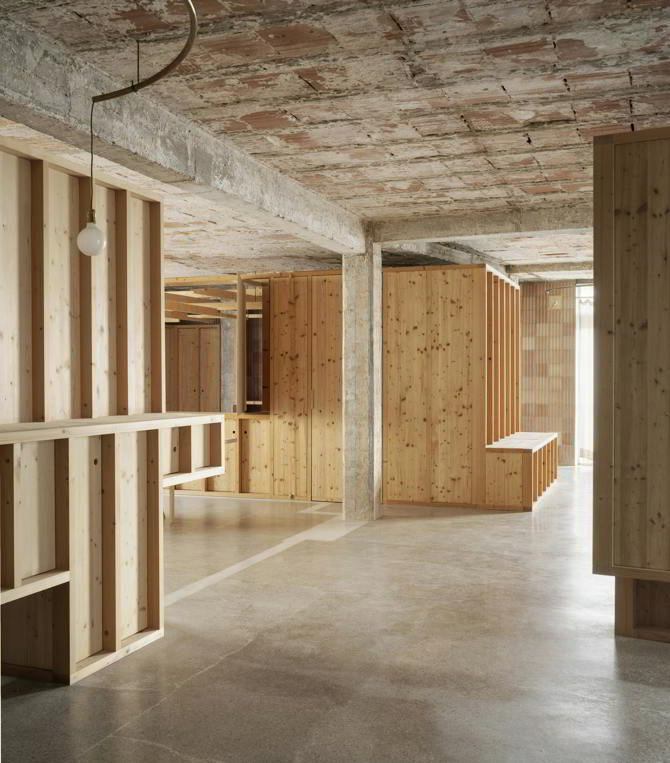 Tres habitaciones cerradas configuran el espacio. Estas se ejecutan en madera, con la finalidad de no cargar la estructura existente y al mismo tiempo mostrarse como otro elemento independiente del resto. Las tres estancias cerradas se colocan a tresbolillo. Serán de madera de abeto, un material ligero que posibilita su libre posición, independientemente de la estructura.