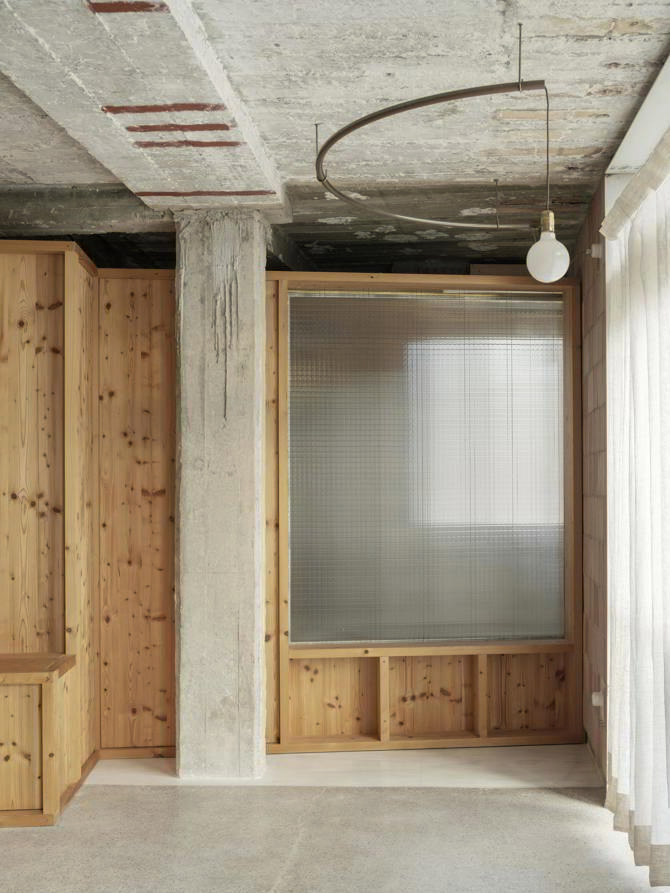El pavimento existente de hormigón se pule. Al mismo tiempo se suturan las antiguas heridas que le dejó la pretérita tabiquería. Esta suturación se hace con piezas de mármol, subrayando el palimsesto y solucionando un problema contructivo. Ninguna de las juntas entre las piezas de mármol coincide con un cambio de dirección de las mismas.