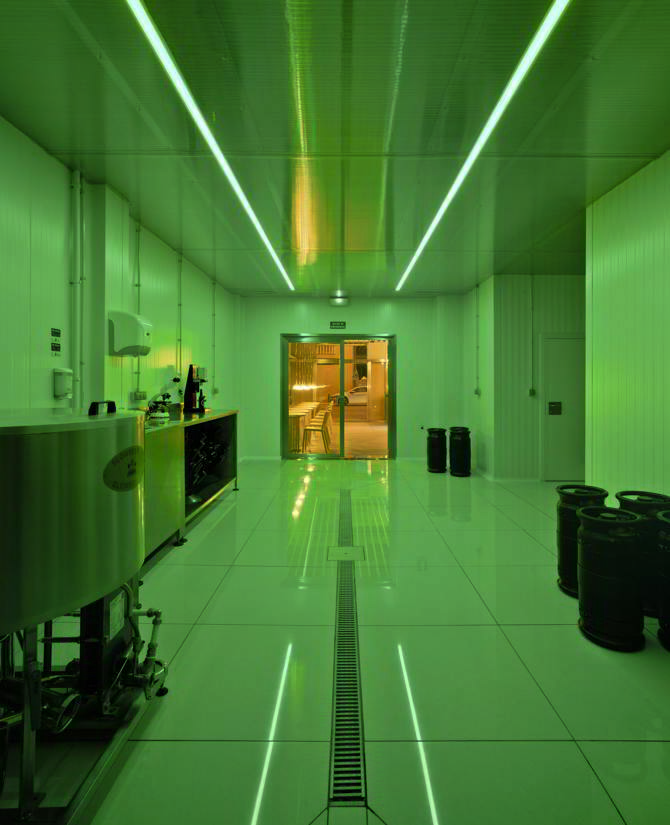 El local acoge simultáneamente la producción y la degustación de cerveza. Esta dualidad programática se resuelve con fluidez: no hay límites rígidos entre fábrica y bar, sino una coexistencia natural que invita al visitante a formar parte del proceso. En lugar de imponer una escenografía artificial, la arquitectura amplifica lo que ya estaba: los olores del lúpulo, el ritmo de las conversaciones, el tacto del vaso frío sobre la madera templada.