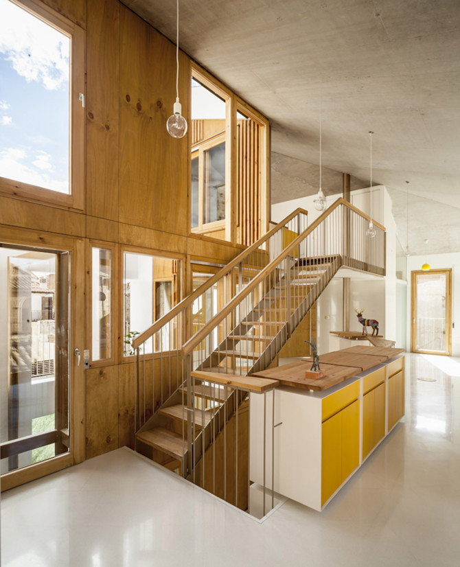Su geometría se adapta en función de las necesidades internas. Las escaleras y el patio se entrelazan. Los rellanos de las escaleras se transforman en espacio de juego, de lectura o incluso de trabajo, frente al patio. Es casual, vivo como la madera. La estructura del edificio refleja estos dos momentos diferentes. Así, es estricta en la fachada y se adapta al patio.