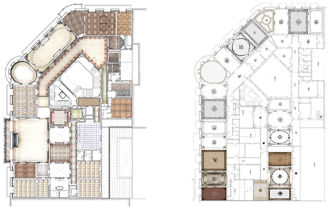 Elementos industrializados La intervención conserva los suelos existentes (pavimentos hidráulicos y pavimentos de mosaico). Los fragmentos deteriorados han sido recogidos y reubicados en salas adecuadas. Se han realizado nuevos moldes para que todo el edificio disponga de artesonados.