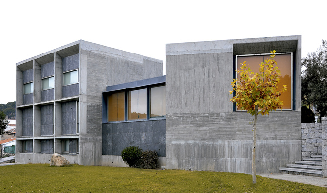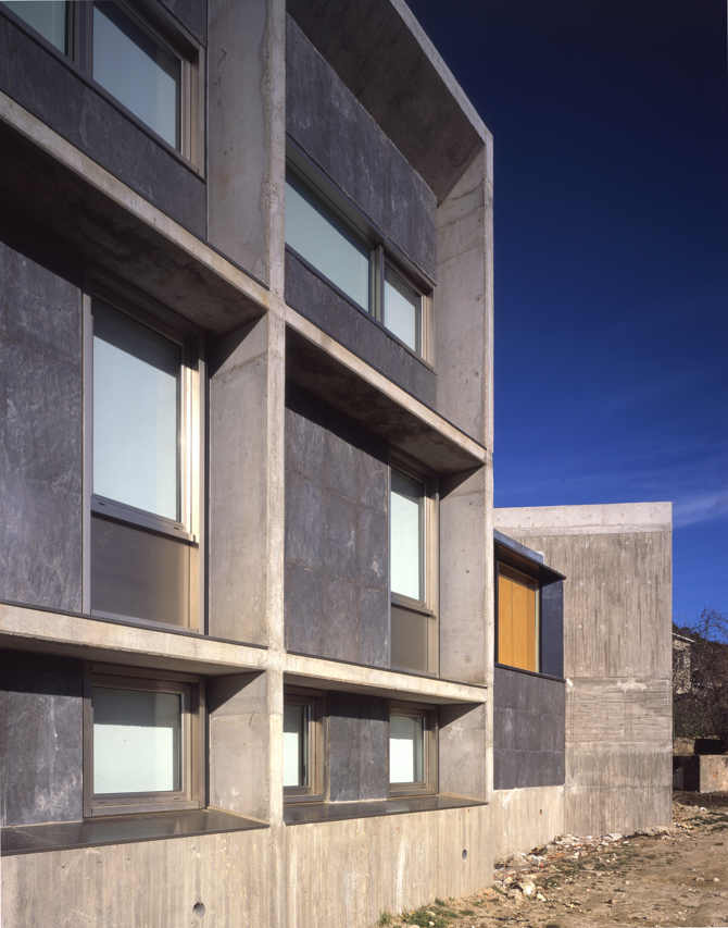 Estructura de hormigón armado vista, muros de carga y retícula estructural de pantallas y losas.