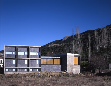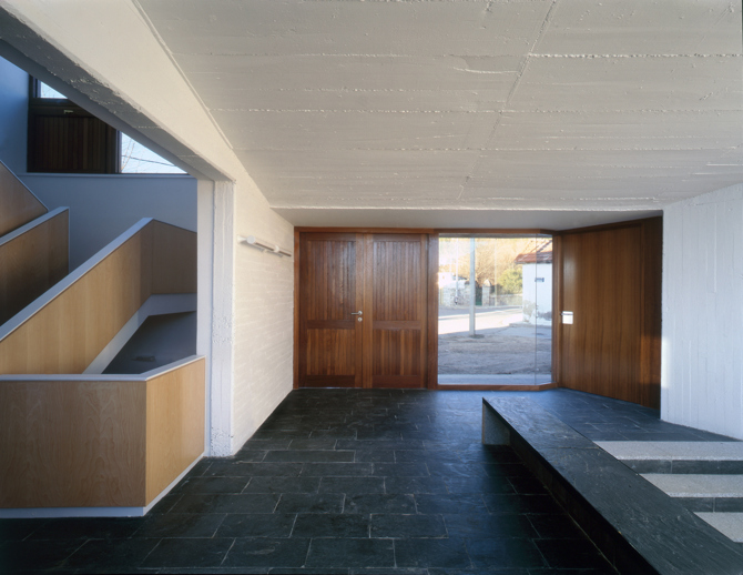 Los materiales –hormigón, madera y pizarra– se integran en la escala cromática del lugar y permiten su estabilidad en el tiempo. El reloj sobre un despiece liso en el muro de hormigón visto y los mástiles recuerdan el carácter institucional del pequeño edificio.
