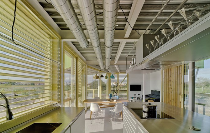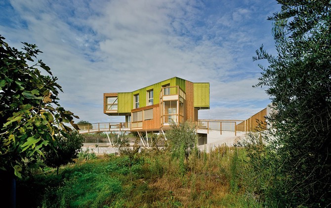 La vivienda se propone como una pasarela que superpone la vida de una familia al cultivo de un paisaje inferior que se mantiene intacto. La construcción se ordena en degradado vertical para minimizar el impacto sobre la parcela original: una losa de hormigón prolonga la acera de la calle sobre pilotes retranqueados hasta conectar con la mota del río en el extremo opuesto del solar. Sobre esta apoya una estructura metálica ligera con distintos vuelos vaciando al máximo las plantas inferiores.
