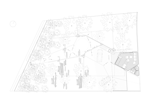 Por último, la jardinería se apoya en una red de canales que nacen en la recogida de lluvia de la vivienda, conectados con el agua de riego de acequia tradicional. Un estudio detallado de especies autóctonas propone un sistema de explotación adecuado a las nuevas condiciones de soleamiento de la parcela, incluyendo un pequeño bosque de ribera –Populus Alba– que aporta intimidad a la vivienda respecto al paseo del río.