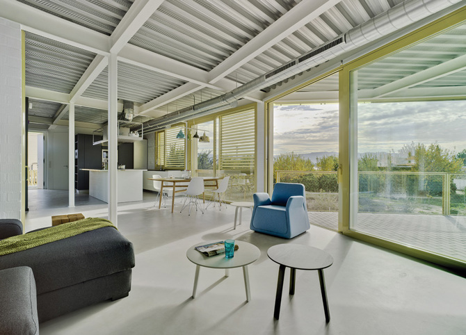 Los revestimientos pretenden un juego doble de integración con el paisaje: por un lado, material y cultural –madera y tejidos metálicos colocados como un parcheado de materiales encontrados parecido al modus operandi de las pequeñas autoconstrucciones de la huerta–; y por otro, mediante un suave efecto de ligereza al ascender, apoyado en texturas cuyo color y traslucidez fluctúan diaria y estacionalmente en función de las condiciones meteorológicas.