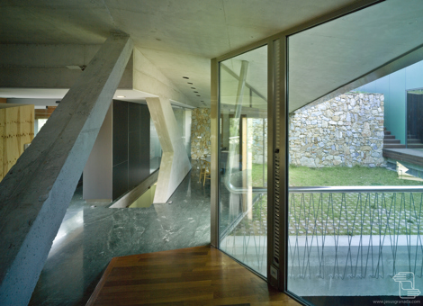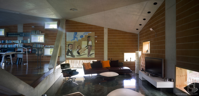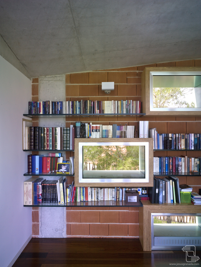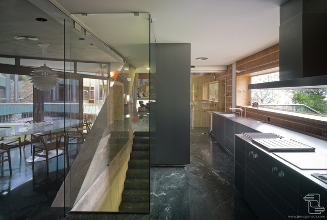La vivienda se realiza como una interface, un dispositivo de intermediación que permite usar lugares de difícil ocupación. La zona inferior es un vaciado en la montaña, donde se incrustan los usos con menos necesidad de soleamiento y un acceso a la zona superior. Entre este acceso y el de la parcela, la sombra arrojada por la parte superior crea un vestíbulo suburbano, exterior y pensado para acceder en vehículo.