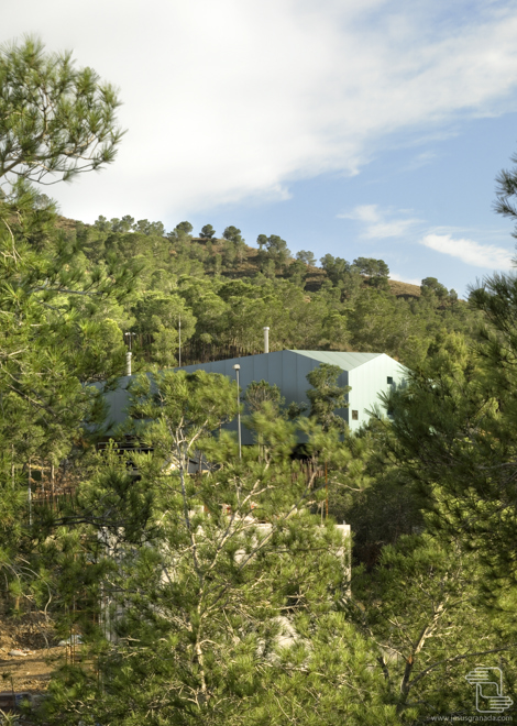 La parte superior, por el contrario, es una grapa que se pincha en el terreno, que queda suspendida, y que genera en su hueco interior una fachada sur que introduce el sol y el viento en los espacios habitables de la casa. Esta zona despegada del suelo acaba en una cubierta acabada con el mismo material que las fachadas, que lo envuelve todo y que permite que el agua de lluvia escurra libremente hasta el suelo, aprovechándola como riego de la vegetación de monte bajo natural del terreno.