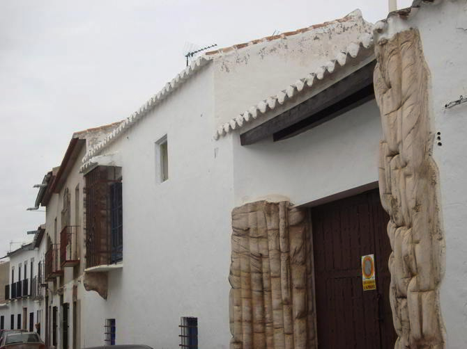 La fachada repite la imagen típica de las viviendas tradicionales de la localidad: muros encalados con pequeños huecos. Y a ese elemento tradicional Fisac incorpora, en el gran portón de entrada, una pieza realizada en hormigón blanco. Los encofrados flexibles conforman en este caso formas verticales que crean elementos abultados en la forma vertical de las piezas, que encuadran el portón estableciendo un contraste entre el gran acceso tradicional y los muros encalados con este nuevo elemento.