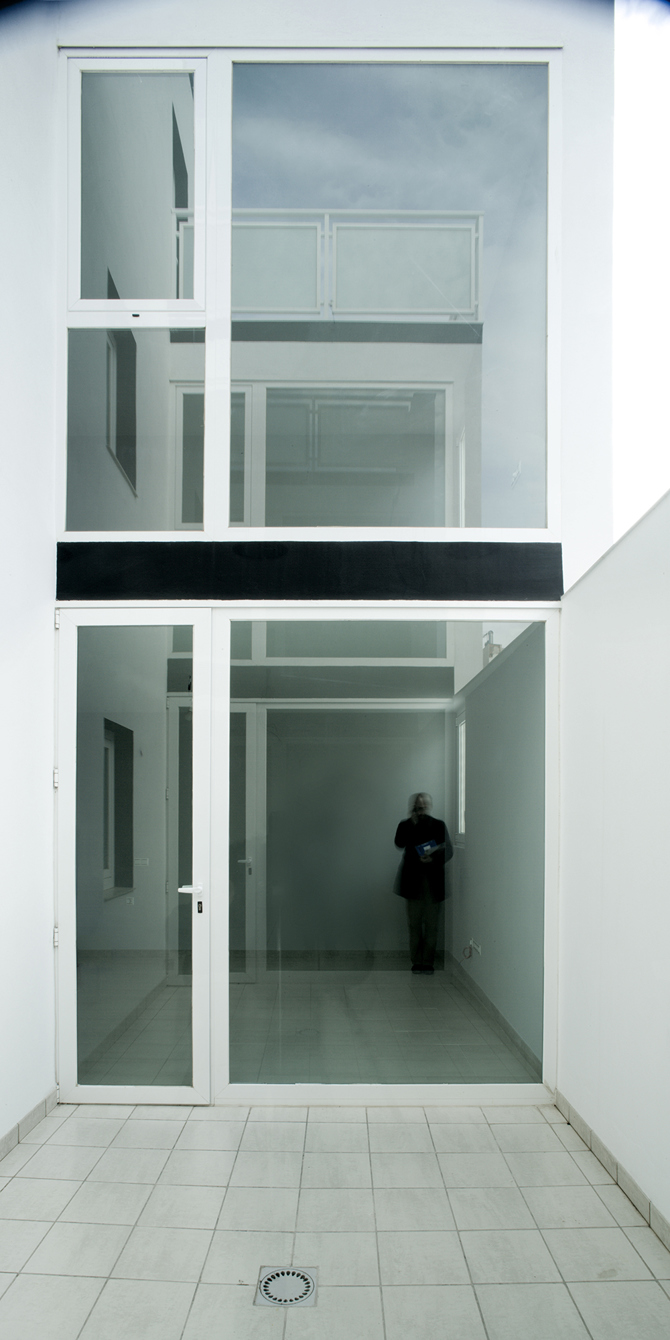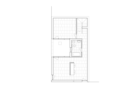 La casa se organiza alrededor de un patio vividero de pequeñas dimensiones, y una pieza central de baño que articula las circulaciones a su alrededor. La anchura del patio se alinea al retranqueo mínimo exigido para el ático, integrando así a nivel volumétrico el cuerpo del ático y que el edificio se entienda como un todo. El patio se usa como extensión de la casa, a nivel visual y físico, protegido climáticamente, convirtiéndose en una salida ancha al exterior sin perder intimidad doméstica, y se configura como el corazón de la casa, hacia el que se abren todas las piezas habitables.