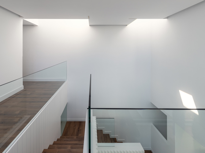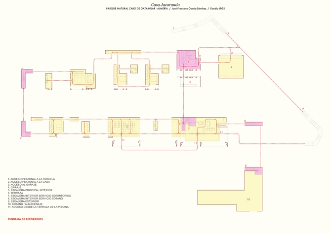 Sobre la plataforma de la planta baja —tanto en el interior como en la terraza de la piscina— se desarrollan las principales actividades domésticas de Casa Jacaranda, permitiendo el intercambio entre el interior y el exterior. La Casa Jacaranda dispone de tres escaleras interiores, una principal y dos de servicio en los extremos. De ese modo, se plantean recorridos non-finitos, que permiten realizar itinerarios continuos. Esta libertad de desplazamiento ofrece al habitante y al visitante una visión más amplia durante la experiencia doméstica.
