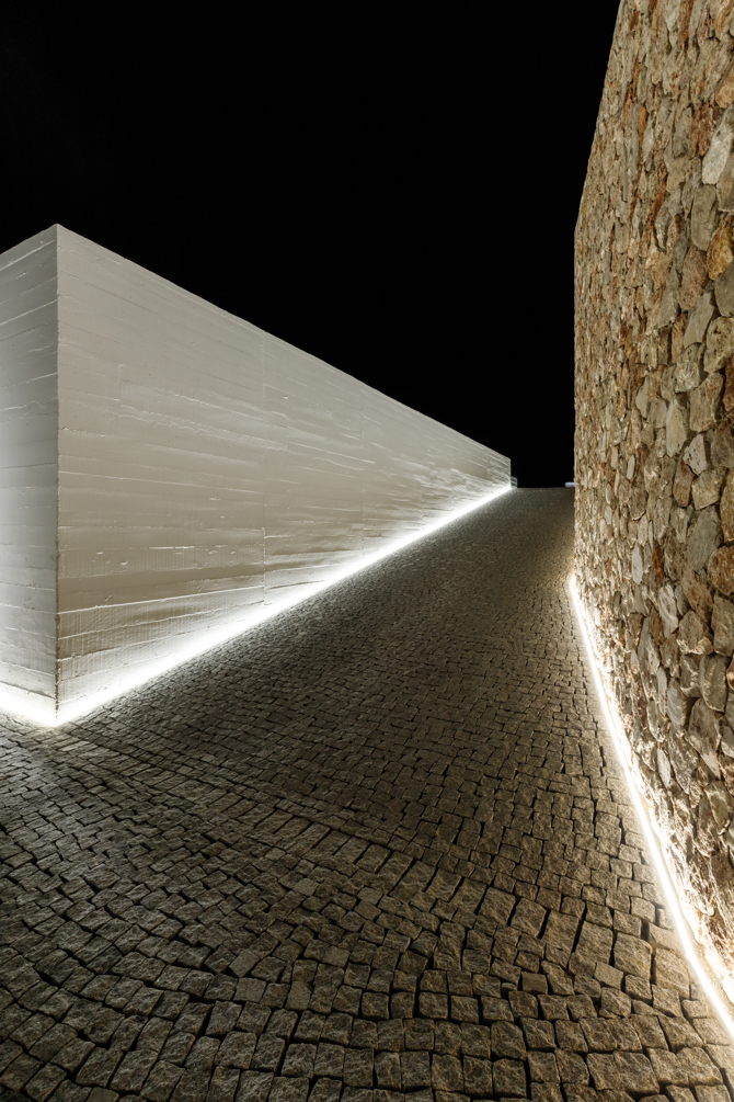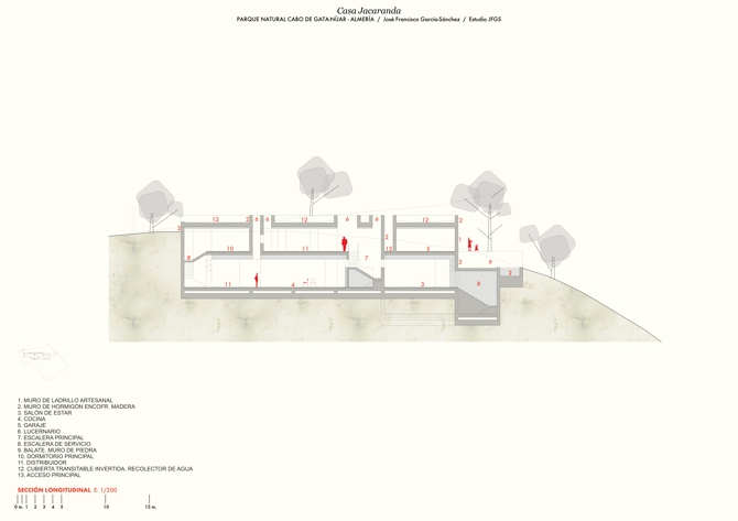 La primera operación del proyecto fue la de realizar la transformación y el desplazamiento de las tierras de la parcela construyendo muros de piedra seca (balates) y bancales a modo de aterrazamientos naturales. Se trata de una forma tradicional e histórica de intervenir en paisajes en pendiente con la voluntad de producir bancales donde poder desarrollar actividades agrícolas. Apoyándose en una de esas plataformas se construye la Casa Jacaranda. Un volumen de hormigón, de ladrillo y de vidrio —de dos plantas— se apoya sobre una gran plataforma horizontal donde se sitúa la piscina y bajo la cual se establece otro espacio de servicio. Por lo tanto, la casa dispone de tres niveles: