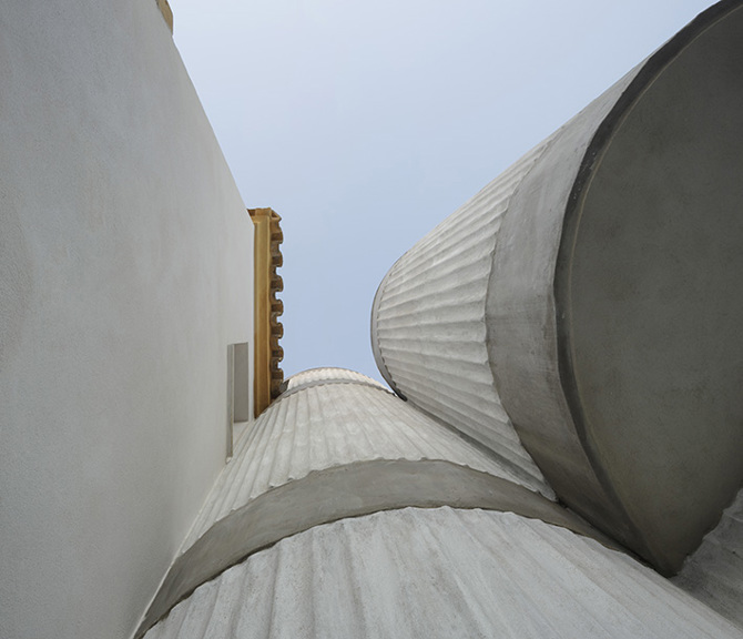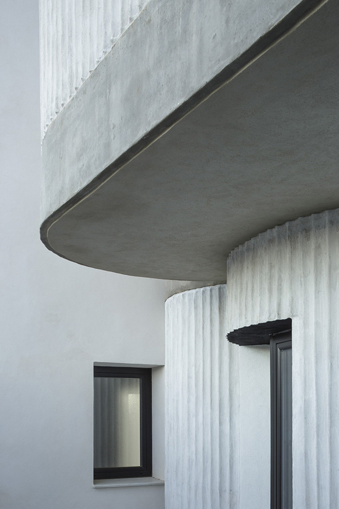 También hemos encontrado en la reverberación de los motivos curvos un vehículo para la coherencia visual de la propuesta, tanto para nosotros en el proceso como para el cliente en lo construido. La curva como expresión de lo añadido a la edificación existente, tanto interior como exteriormente.