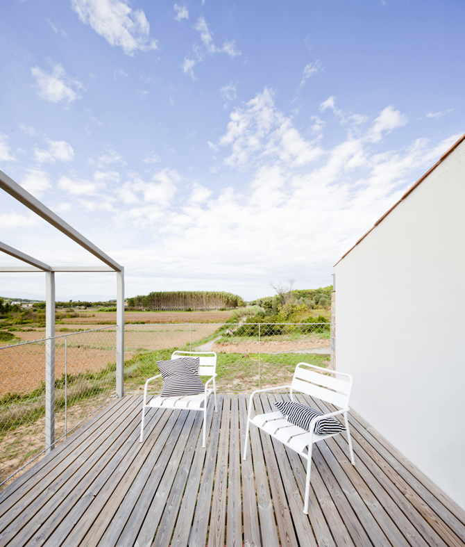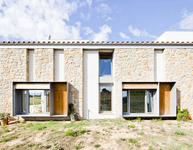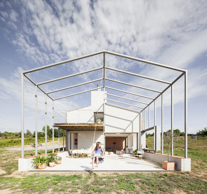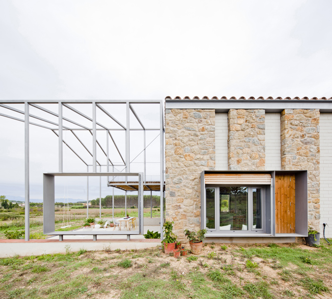 El espacio de circulación interior de la vivienda adquiere unas proporciones dignas de un exterior, con una mayor altura y con varios volúmenes que ofrecen ventanas a este espacio. La voluntad en este proyecto es la de desvanecer el límite entre interior y exterior o, visto de otra manera, conseguir las cualidades de un exterior en el interior de la vivienda, y viceversa, el confort de un interior en el exterior. Siguiendo esta lógica, la sección de la casa, en el extremo con vistas al pueblo y a los Pirineos, continúa en el exterior mediante un porche a doble altura que, con el tiempo, esperamos sea cubierto por vegetación y persianas de madera que ofrecerán la sombra necesaria en los meses de verano.