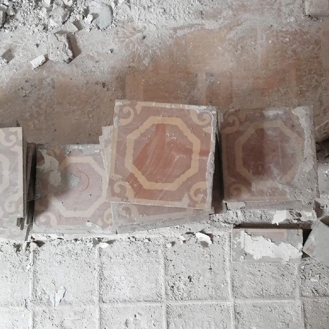 La casa para Alex y Nuria está definida por tres alfombras cerámicas recicladas de los propios pavimentos. La primera en la galería, y las otras dos en cocina y zona de trabajo. Además de esto, sobre el ladrillo existente, fuera de la naturaleza que fuese, se realiza un enfoscado de mortero de cal con un posterior talochado, rejuntando las piezas y haciendo menos obvia la naturaleza textil de esta materia. Al ladrillo, en todas sus operaciones, se le da de una segunda vida, se permite que exprese su voluntad material.