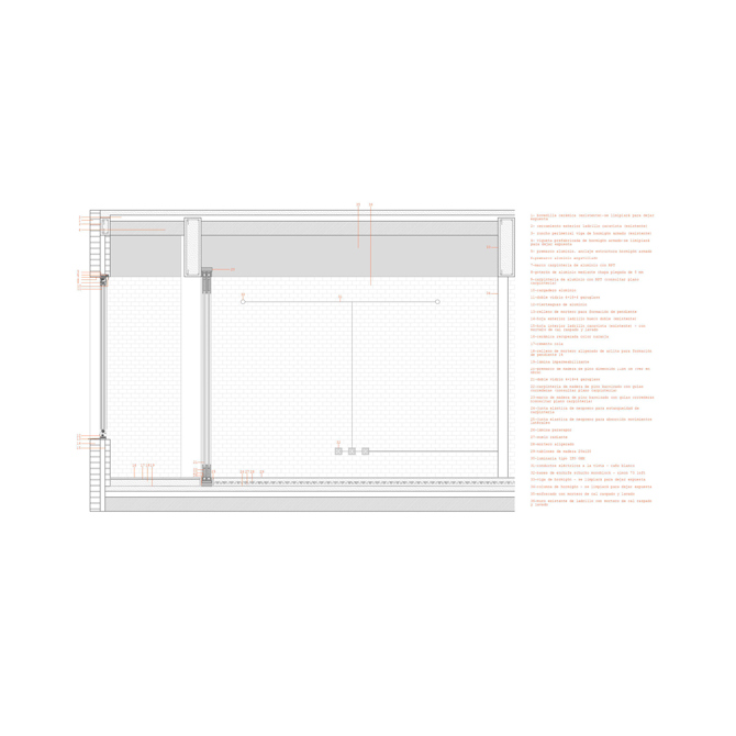 La estructura de hormigón que define la vivienda se utiliza como capa estructurante del espacio, cada viga define un umbral. El suelo se ejecuta mediante madera de roble de gran formato, y es el único material de nuevo orden en conjunto con las puertas que aparece en la obra.