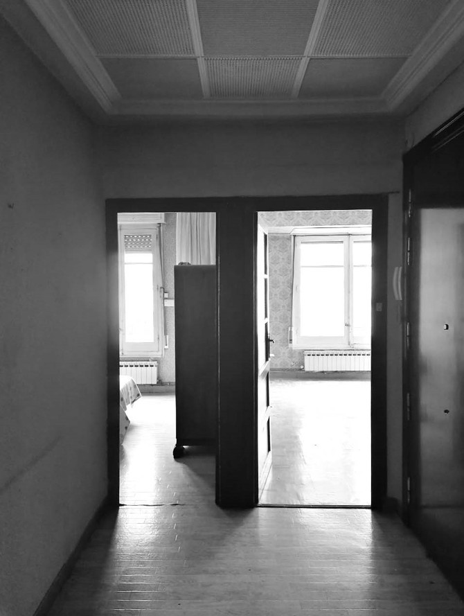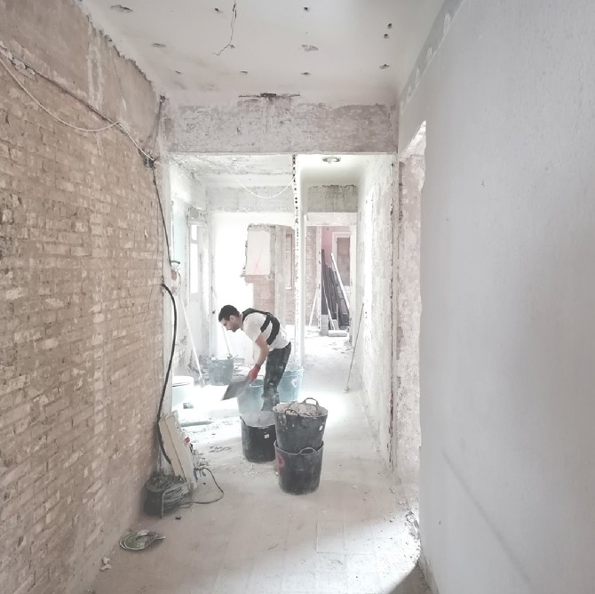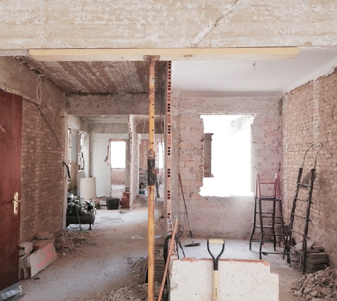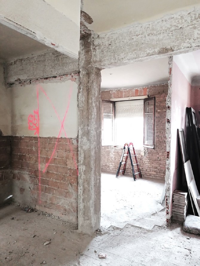 La nueva casa se ejecuta mediante demoliciones parciales, cortes y algunas adhesiones de tabiquería de ladrillo de 7 cm de espesor. La cocina se ubica al frente y se ejecuta en torno a la tabiquería existente apoyando una nueva mesa de hormigón in situ con árido procedente de la demolición. A continuación de esta, el comedor dispone de un banco corrido, de nuevo en hormigón in situ reciclado, que define este espacio. En conexión con el mismo, se ubica el salón que dispone en lo que anteriormente era una galería de un nuevo espacio intermedio, una logia interior. Esta se define a través de una carpintería de madera de pino que se coloca contra la viga como si de unas gafas se trataran. Una capa con la otra, no contra la otra. Al extremo contrario, otra carpintería de madera delimita la zona de noche y de trabajo de la vivienda. Tras esta, la tercera mesada de hormigón se convierte en el escritorio de trabajo, usando la luz natural de ambos patios.