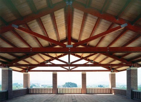 El complejo agrícola se ordena a lo largo del eje que, partiendo de la antigua masía, recorre el acceso arbolado, el patio, el lago y el restaurante.