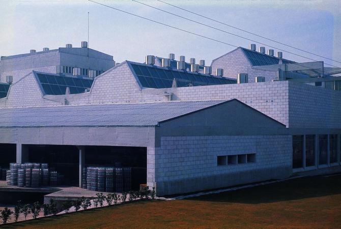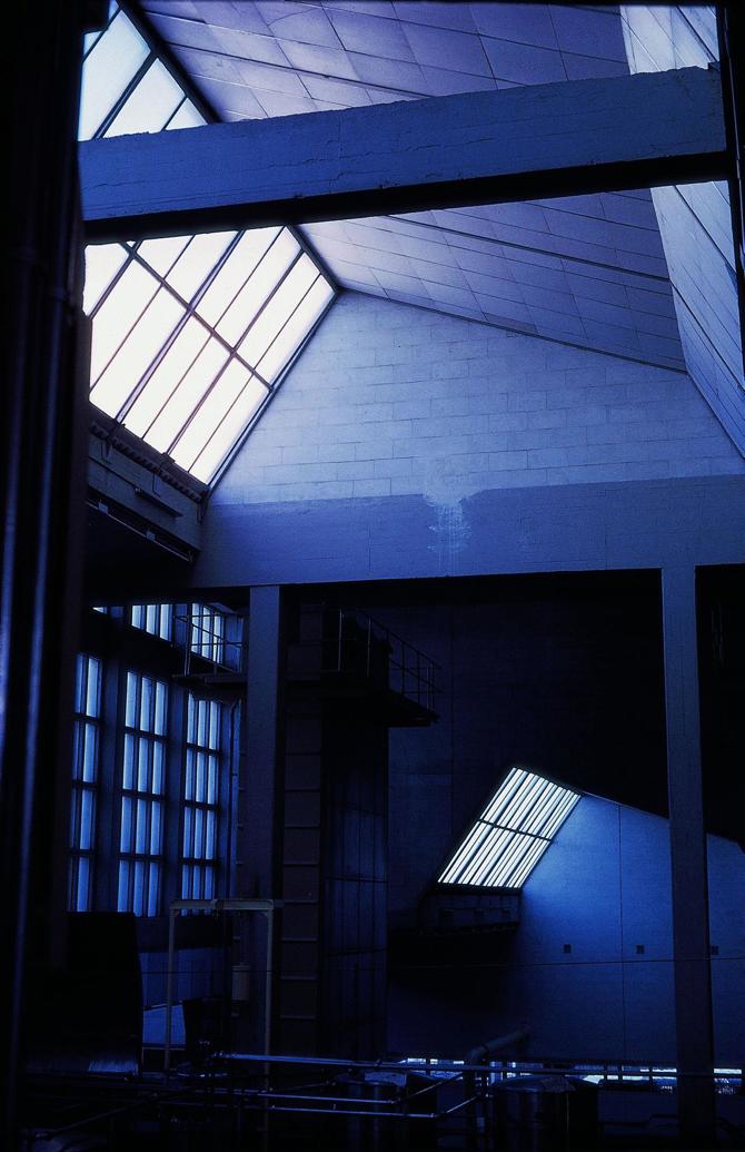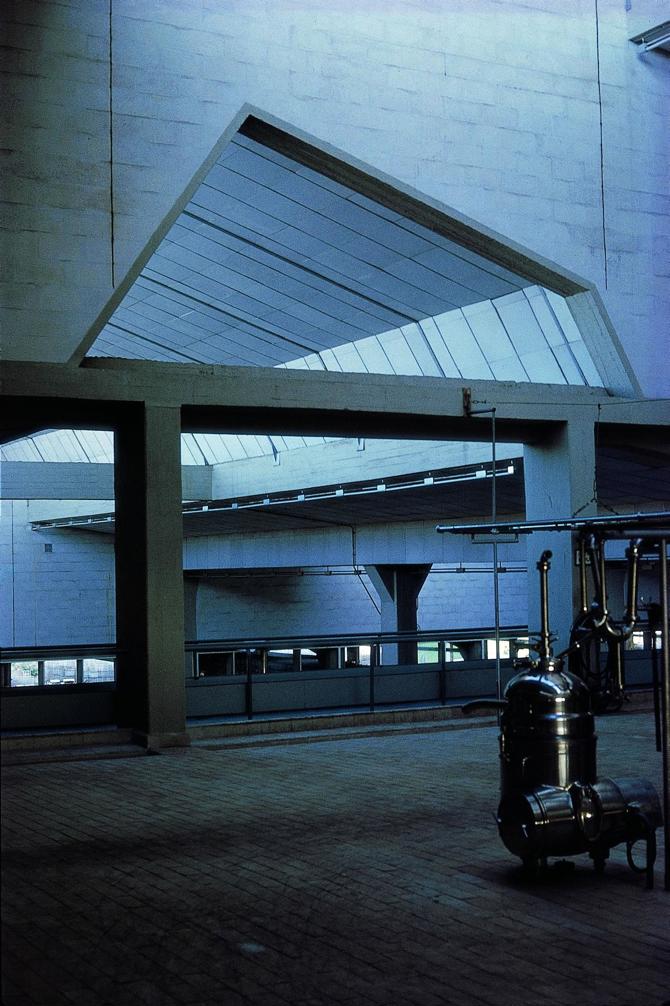 La elección del hormigón como material dominante, en aquellos años en los que aún escaseaba el hierro, condicionó una construcción masiva, cuyo aspecto calcáreo remarca aún más si cabe su sencillez y rotundidad. Solo las siluetas quebradas en diente de sierra de los lucernarios adquieren cierto protagonismo, frente a la serenidad de la intervención, marcando al tiempo un ritmo acompasado. Hacia el interior, estas bandas de luz zonifican el amplio espacio de producción en dos ámbitos diferenciados y, aun a pesar de ello, aquel se percibe como un todo.