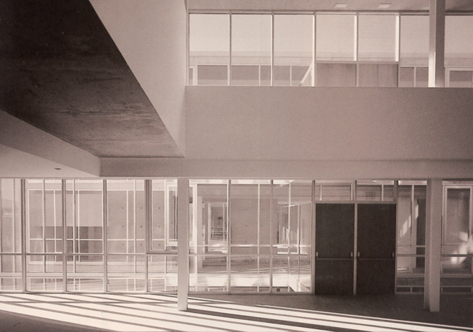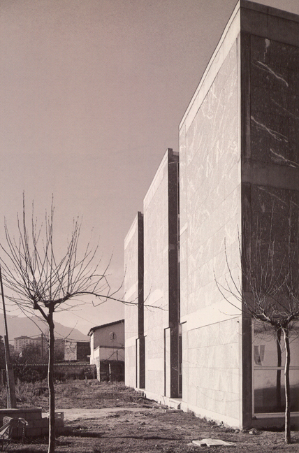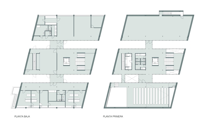 El edificio se adapta a la forma de la parcela, asumiendo su falta de ortogonalidad. Se compone de tres alturas y sótano. La superficie construida total es de 1.875 m2. El volumen, compacto y unitario en apariencia, se fisura transversalmente originando dos pasillos que contienen los accesos generales del edificio y resuelven la unión entre los dos viales paralelos que constituyen el soporte urbano de la zona. El volumen prismático de piedra se descompone así en tres piezas que se miran entre sí a través de fachadas acristaladas.
