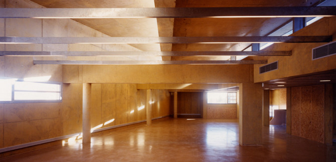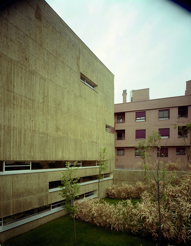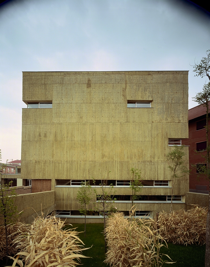El programa del centro se compacta en la parte libre de la parcela, alineado a la acequia, generando un volumen vertical que se yuxtapone al cuerpo horizontal que reconstruye y engloba el espacio del molino, en una secuencia escalonada hacia el cauce de agua. Se inserta en un entorno hostil, de edificios de vivienda de reciente construcción y de mayor altura y volumen. Afronta su inferioridad de condiciones con dos decisiones: tallando un volumen abstracto y sin elementos de referencia de dimensiones visibles, y proyectándose a través de un largo recorrido de acceso.