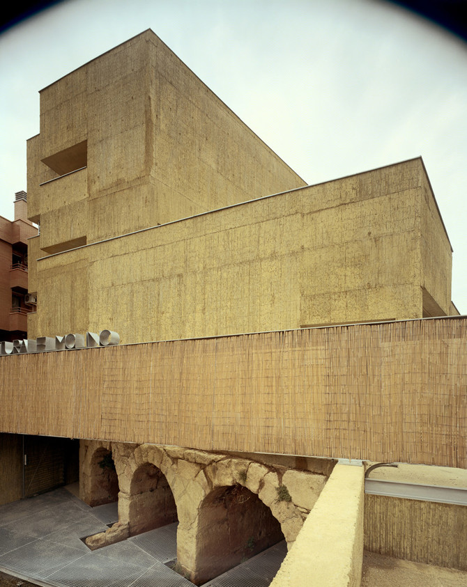 El ámbito entre El Molino y la plaza Aragón se trata como parte del centro cultural, una gran sala exterior que desciende desde la cota de la plaza hasta la lámina de agua que aflora de los túneles de desagüe. El nuevo edificio hace referencia a la arquitectura tradicional local y al propio molino, con un carácter fuertemente murario. Todo el edificio y los espacios exteriores son prácticamente de un solo material, un volumen pétreo al borde de la acequia, de apariencia tosca pero de traza precisa. Su estructura, cerramiento, pavimentos y algunos techos son de hormigón teñido en color ocre, la evolución constructiva de los muros de tapial y de piedra y argamasa tradicionales. Su textura se genera a partir del material que abunda en todo el cauce de la acequia, las cañas, con las que se encofra la cara exterior.