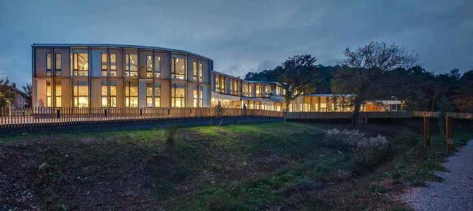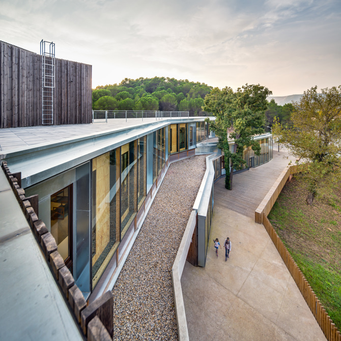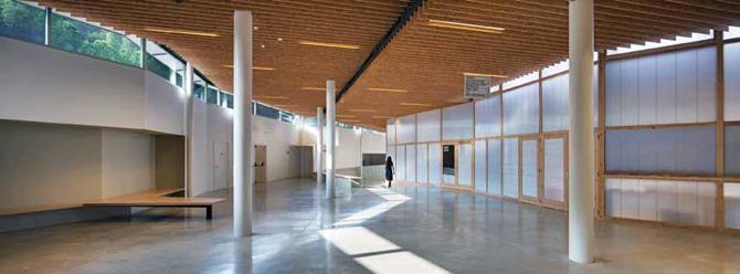 Todos estos espacios se articulan a través de un ágora cuya morfología, materialidad e iluminación natural procuran una atmósfera natural que recuerda a la que se disfruta al recorrer el arroyo. Diseñado con criterios de sostenibilidad, el edificio cuenta con el certificado de eficiencia energética tipo A. Sus principales características y beneficios son un diseño pasivo, que reduce el consumo de energía en comparación con la línea base; una calefacción y ACS suministrados por una central de biomasa; el uso de materiales renovables, y un sistema de recolección de aguas pluviales.