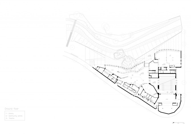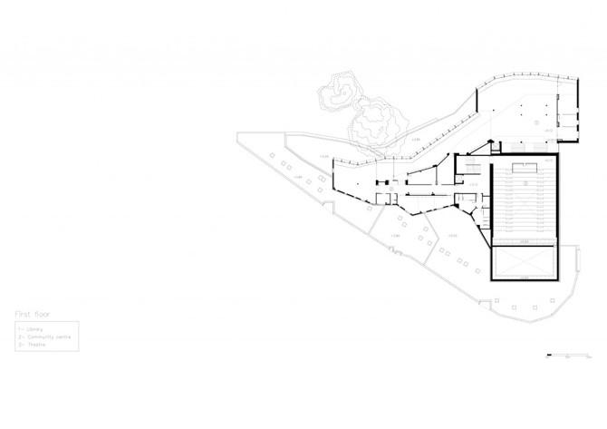 En el interior, cada parte del programa encuentra su lugar natural, casi respetando la lógica hidráulica por la que la erosión y el sedimento definen el borde de la ribera del arroyo. Así, el interior está organizado en capas longitudinales siguiendo la línea de la riera y dando como resultado espacios más o menos dilatados, que tienen una materialidad progresiva más dinámica, fluida, clara y acuosa cerca de la fachada del arroyo y más sólida, opaca, privada o pétrea frente a la montaña. La biblioteca se desarrolla a lo largo de esta fachada paisajística abierta que ofrece magníficas opciones turísticas. El teatro, las salas de ensayo y los diversos servicios de tipo más cerrado se encuentran en la última capa o lugar más alejado del arroyo.