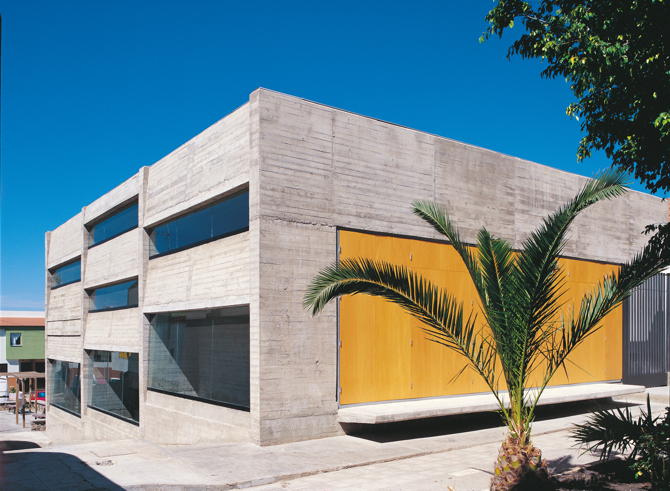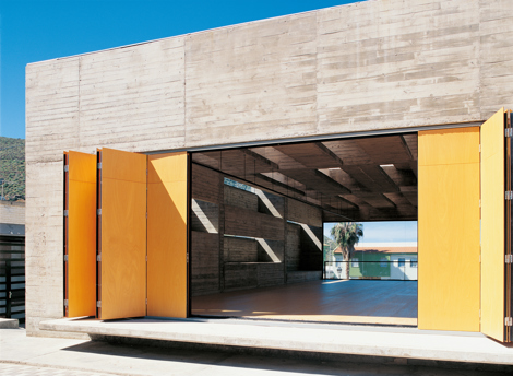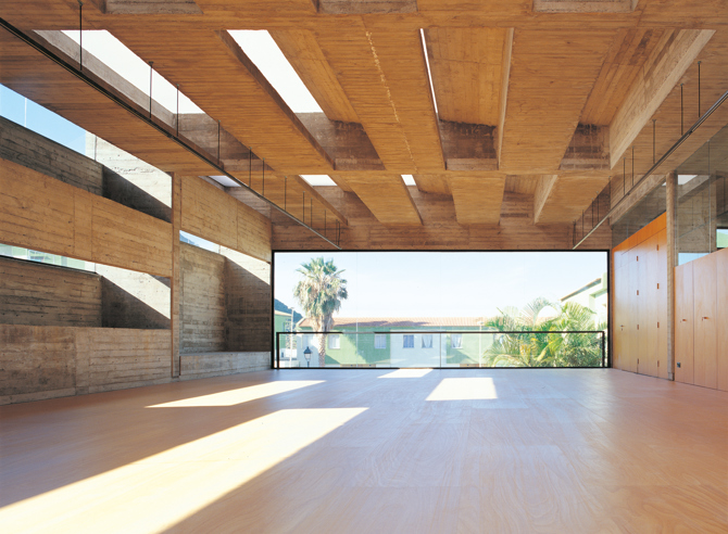 Estructura apantallada de hormigón armado visto; vigas de cubierta en 'z'; cubierta de policarbonato traslúcido; tarima de madera