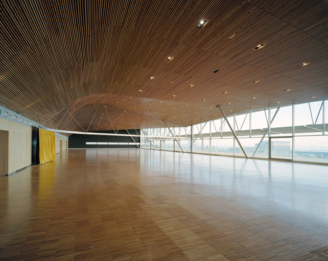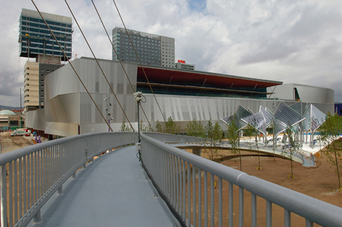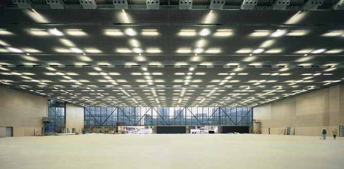 El Centro de Convenciones Internacional de Barcelona consiste en una gran sala (15 000 m2, 80 m de luz estructural) divisible y un bloque de servicios anexos abierto al mar. Se polarizan sobre una línea (calle Taulat) y se despliegan como un magma eruptivo cristalizado sobre una masa baja con emergencias geométricas. La arena de la playa con la geometría del polígono.