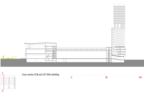 La franja A (norte) de edificios complementarios al centro de convenciones (hotel, oficinas) debía ser más urbana, mineral, inorgánica, dura. Sobre la base del volumen edificable normativo, los movimientos en la banda A se producían como reflejo de los diversos citeriores funcionales/promocionales que se iban definiendo. Configura un límite, un muro que, sin embargo debe ser abierto. Por su gran altura debe tener una multiplicidad de lecturas: en continuidad como frente a la calle, volumétrico y abierto en su parte superior frente a las visiones distantes desde la ciudad, en donde el centro comercial actuará de zócalo. La franja B (gran sala) es básicamente una cubierta que debe pensarse como espacio público, como gran plaza con voluntad de continuidad hacia el exterior. Debe ser abierta e interrelacionada, cerrada y autónoma.