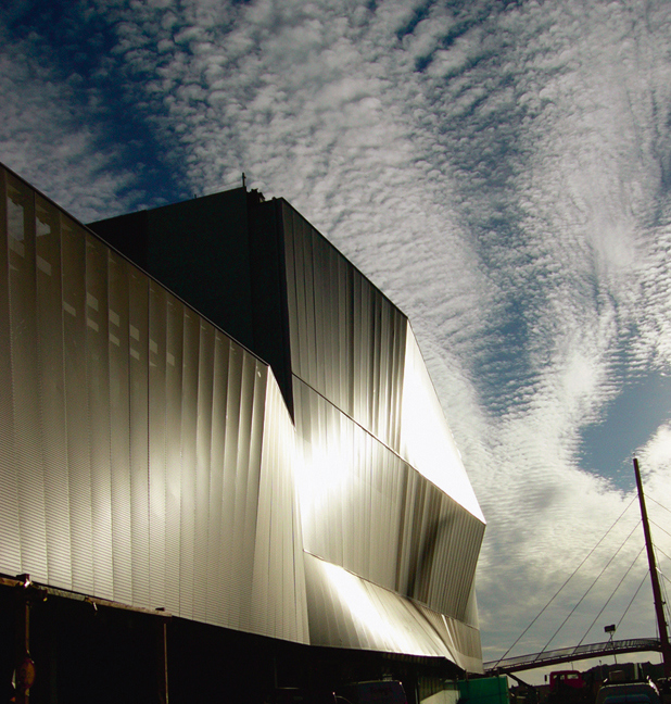Sistemas prefabricados. Fachada formada por paneles ligeros perforados con dimensiones variables o repujados (incisiones sin llegar a perforar la pieza), permitiendo una superficie continua adaptable a diferentes necesidades funcionales del interior