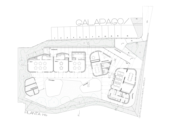 La obra consistió en la construcción de un centro de educación infantil en Galápagos, que incluye aparcamiento, patio exterior, tres aulas, salas comedor/polivalentes, preparación de comidas y administración. El edificio se realizó con la voluntad de crear un espacio más sensible, humano, teniendo en cuenta al usuario final, la perspectiva de género y contemplando un sistema de eficiencia energética.