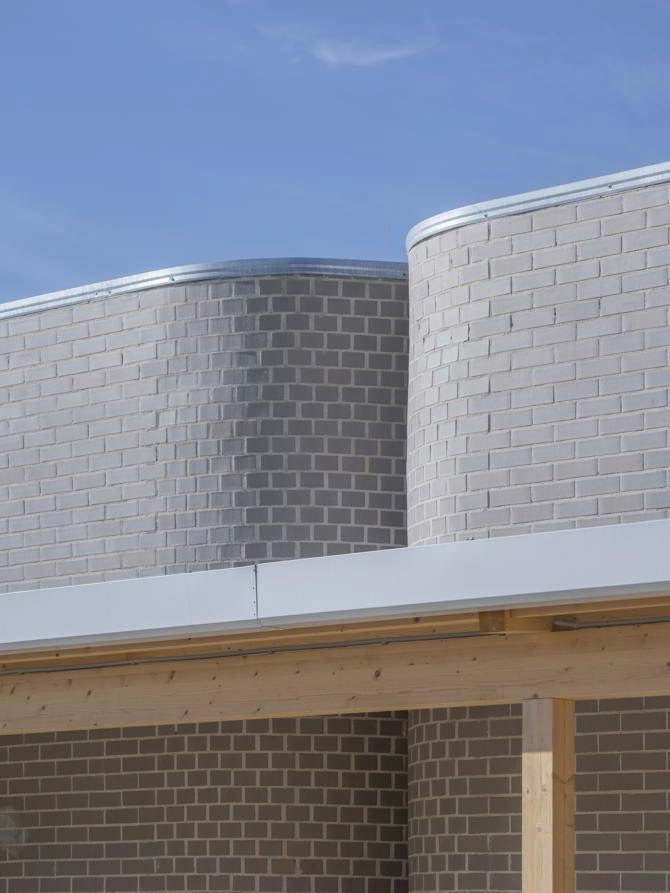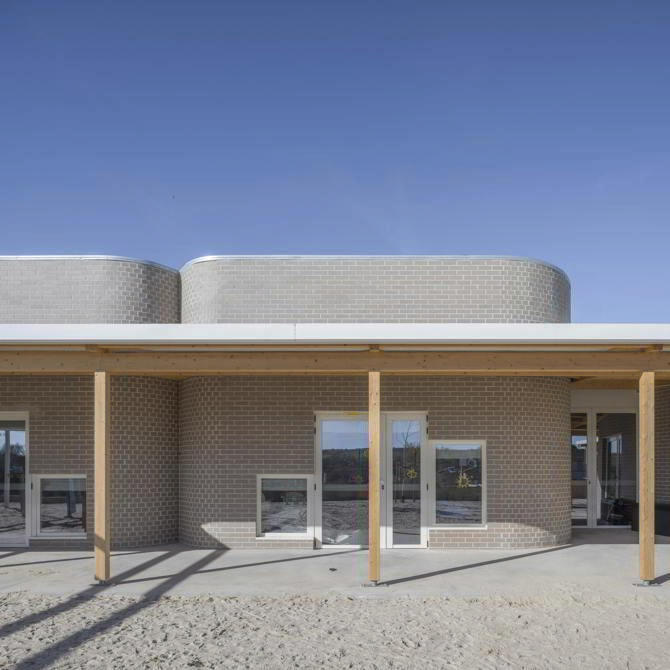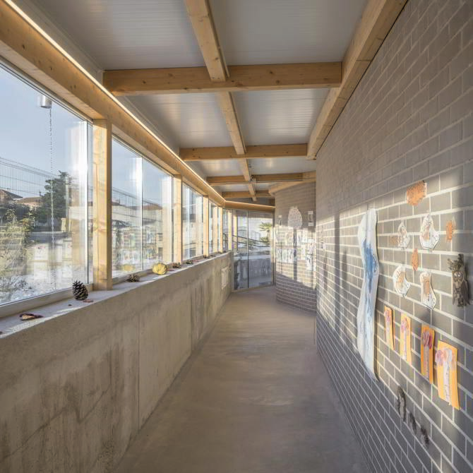 El interior de los volúmenes adopta formas curvas y colores distintivos de tonos claros, además de contar con 18 cm de aislamiento térmico en fachada y 20 cm en cubierta. La orientación de las aulas a sur con las aperturas protegidas y la ventilación cruzada a través del pasillo aseguran el funcionamiento pasivo del edificio. Además, cuenta con limitadores del consumo de agua, sistema inteligente de iluminación LED DALI, sistema de calefacción y ventilación por aire con recuperador de calor, procurando una eficiencia energética de calificación A al edificio, superando los estándares nacionales y en consonancia con los objetivos de desarrollo sostenible de la Agenda 2030. El mobiliario de madera y las ventanas de baja altura configuran unos espacios adaptados a sus pequeños habitantes, teniendo en cuenta al usuario final y la perspectiva de género. Por último, el edificio trata de alejarse de una imagen institucional de un colegio infantil y crear una arquitectura más sensible, sanadora y humanizada. El diseño de los jardines y el patio exterior, con vegetación y juegos, continúa el ensoñamiento del interior, permitiendo a los niños tener una experiencia completa, y así darles la oportunidad de