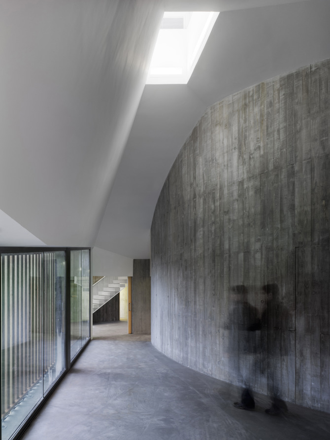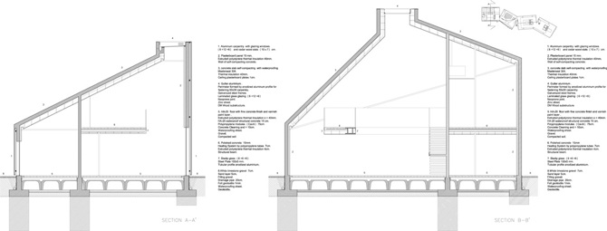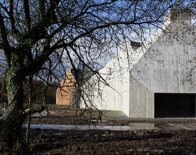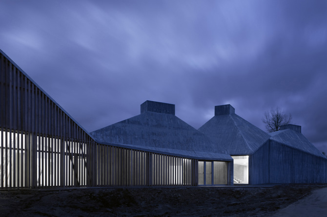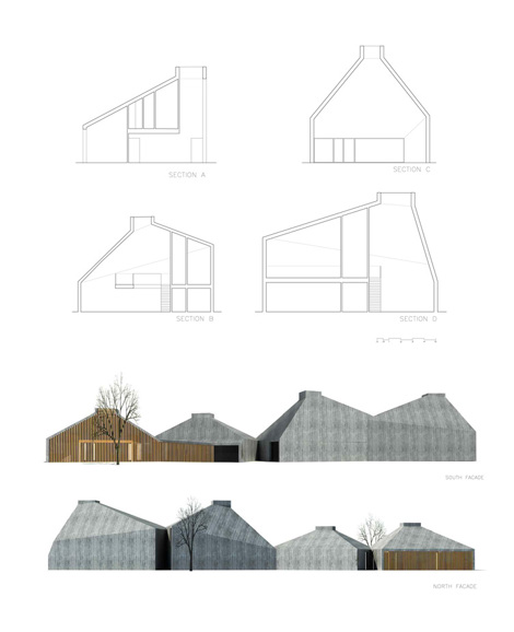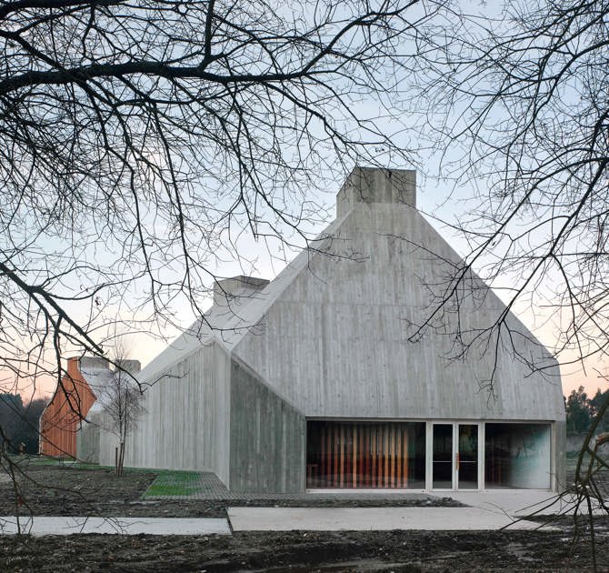 La pieza resultante es la suma de cuatro módulos que se unen y forman una secuencia y un recorrido de usos vinculados. Formando un camino más en el bosque que se adapta a su vez a la forma alargada de la parcela. La cubierta recurre a la solución tradicional de cubierta a cuatro aguas que se recicla y abre al exterior mediante lucernarios que la culminan para dotar los espacios de una fuente natural de luz. Las cuatro cubiertas se unen y descomponen según las necesidades del espacio que acogen formando piezas singulares que dotan de un carácter público al edificio.