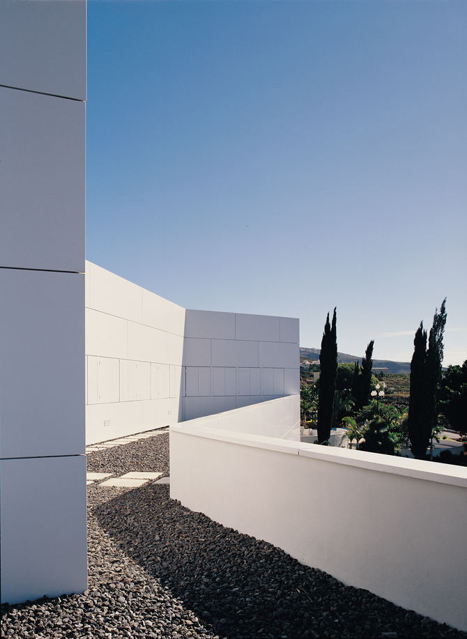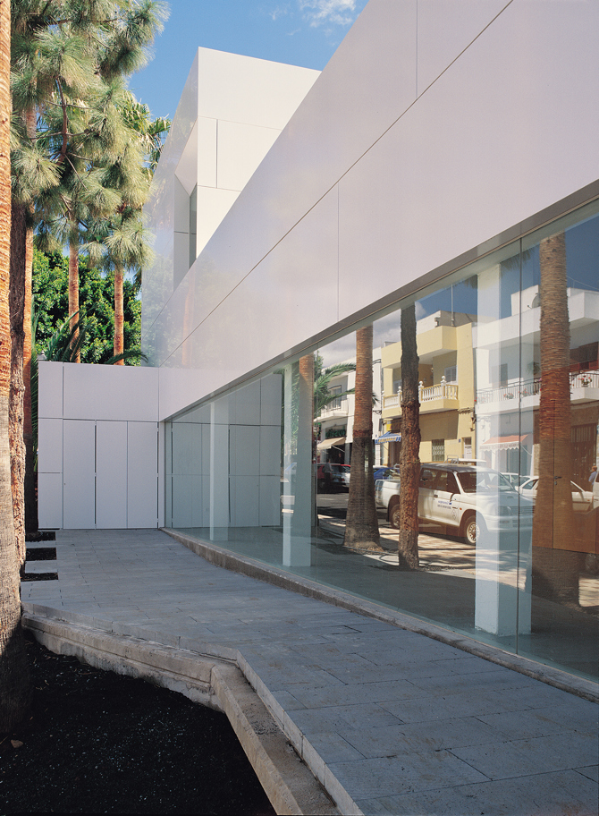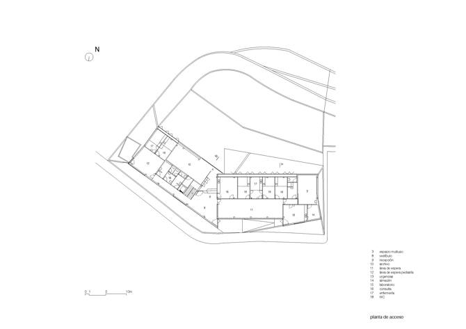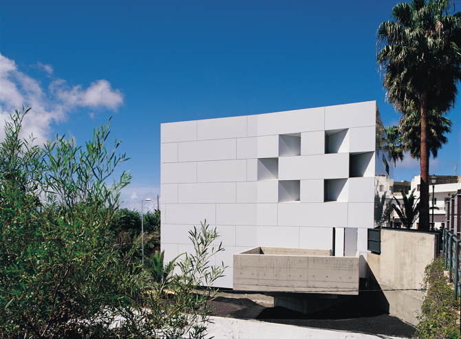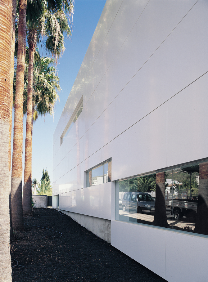 El edificio se configura por el diálogo entre dos pieles continuas: una exterior, formada por placas de aluminio que le confieren su presencia urbana; y una interior de “madera”, que transforma el vacío delimitado por la piel exterior en una sucesión de espacios que, según el programa, deben funcionar con cierta autonomía. Esta segunda piel separa los usos específicos, más privados, de las zonas públicas como: recepción, escalera, salas de espera y corredores, construyendo una superficie de contacto que organiza los recorridos.