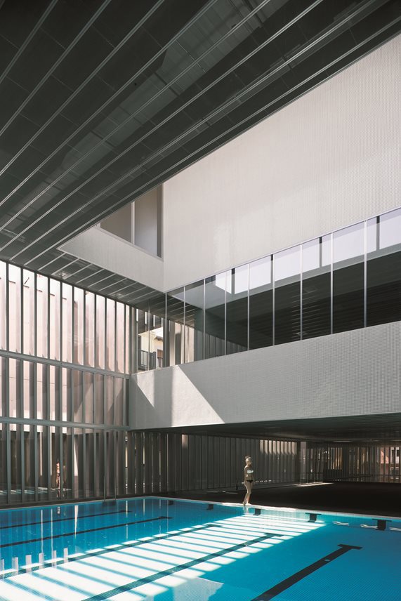 El proyecto asume la prescripción urbanística de introducción de un pasaje de desarrollo longitudinal; al mismo tiempo, trata de mostrarse sensible a la medida en que la construcción afecta a las edificaciones vecinas con la apertura de patios o eventuales retranqueos a algunas de las más comprometidas de las situaciones generadas en el perímetro de la implantación. A partir de las consideraciones debidas a su encaje urbanístico, la propuesta pretende constituir una solución idónea para el programa de usos establecido, que corresponde a una dotación deportiva, recreativa y de salud.
