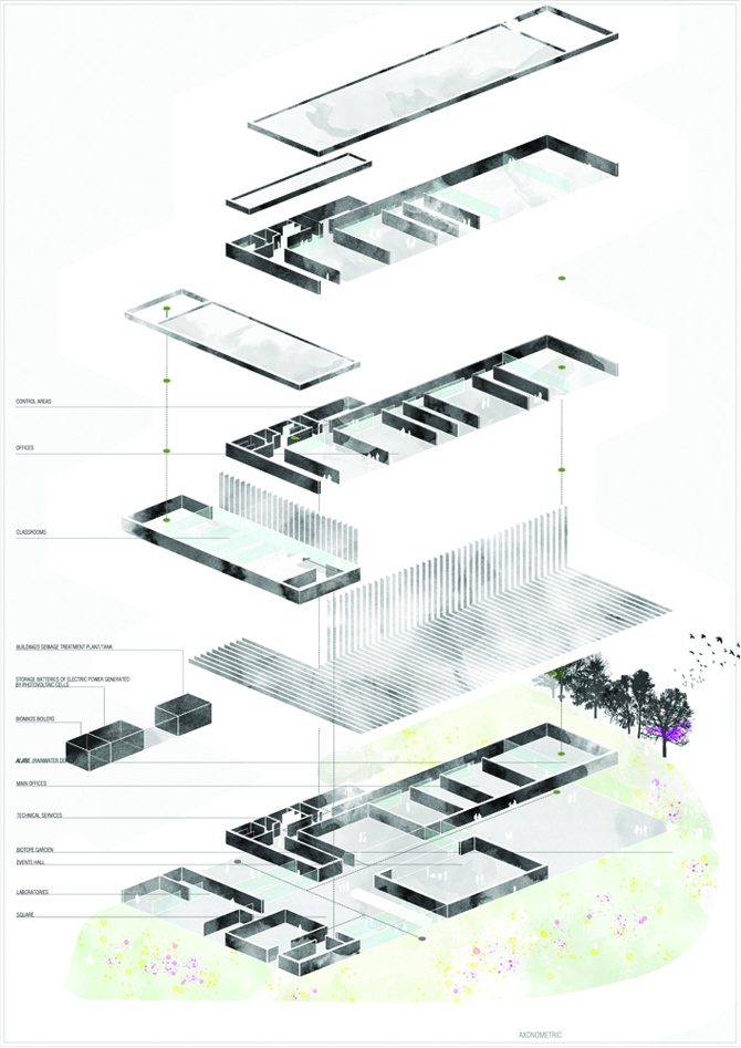El proyecto se concibe como un dispositivo topográfico, urbano, paisajístico y arquitectónico para el territorio y la ciudad. Para el territorio, como información y control efectivo del agua (aguas pluviales, residuales, agua almacenada…) en la región; para la ciudad, como punto de encuentro para la concienciación de los recursos naturales, pero también como edificio que se encuentra en un punto crítico de la ciudad, en el límite del casco histórico con el ensanche moderno, el crecimiento urbano de los años sesenta, en un hueco que siempre ha estado vacío. En ese vacío urbano, los caminos generados naturalmente por las personas que ocuparon el barrio durante años marcan las huellas del lugar de una forma más fuerte que las calles o las normas…