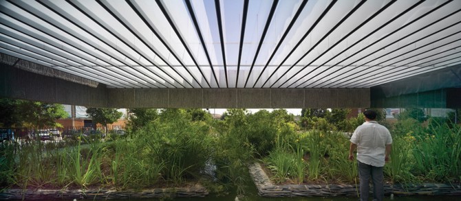 Las tres piezas densas se unen por el foyer, claramente abierto al jardín, que permite el paso del edificio sin alterar sus usos, como gran elemento de interfaz urbana. En ese espacio, pantallas de gran formato informan del ahorro energético del edificio y de las instalaciones hídricas que en él se monitorean, de la depuradora y de las plantas de aguas residuales de la región: informar es concienciar.