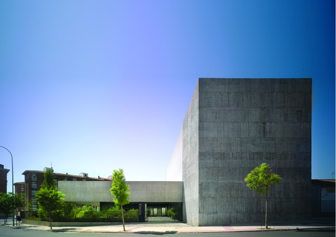 Las piezas principales son de hormigón teñido de negro texturizado con cañizo de río local, abiertas a la mejor orientación a través de fachadas acristaladas apantalladas por parasoles metálicos, que son a la vez protección solar y estructura, el exoesqueleto del edificio. El luminoso foyer se prolonga hacia el exterior por una pérgola en el acceso al paseo que también cubre el jardín de la umbría.