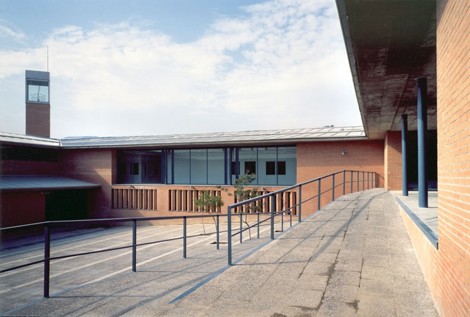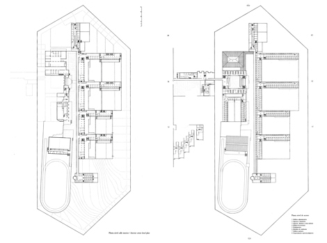 Se remodeló el terreno, rebajándose la parte más alta para aumentar el funcionamiento y la comunicación entre las diferentes partes. Al hacerlo, se logró una mejor integración de todo el conjunto en el paisaje. La entrada principal nos lleva al patio de distribución, que organiza un espacio mixto y nos traslada a los niveles del espacio interior.