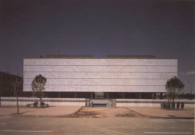 Edificio intemporal, abstracto, más cercano a las infraestructuras que a la edificatoria. Sin fachadas. Y, sin embargo, la envolvente se convierte en el equilibrante energético básico y sensorial del conjunto (temperatura, luz, aireación y aislamiento acústico). Un recinto “amurallado” levitado. En la cristalización del mármol (hallado en el Alentejo portugués y cortado en Cintra, junto a Lisboa) está el homenaje a la luz, que lo traspasa y lo contiene. De día hacia el interior y de noche hacia la ciudad. La luz devenida de la energía eléctrica controlada y la emergente que se difracta en el agua pulverizada ofrecen su reencuentro en los diversos registros de la vida del edificio.