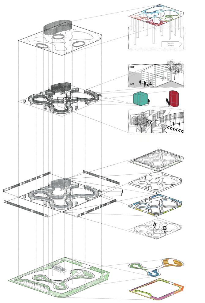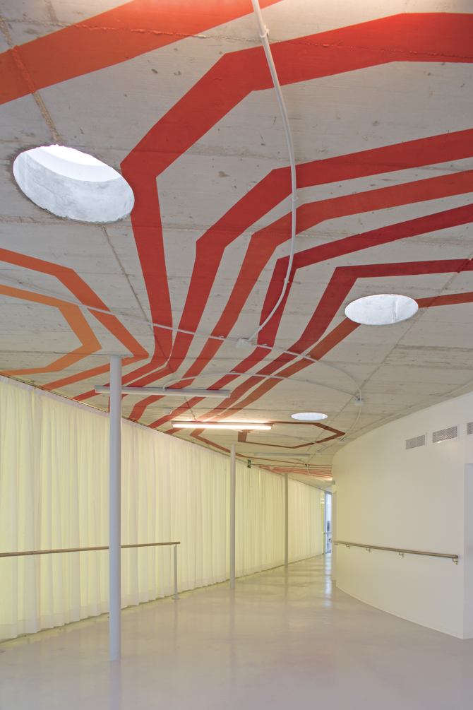 Entre área residencial y el perímetro recto exterior del edificio, se genera el espacio-circulación. Es un espacio abierto, interconectado, fluido, plano y poco habitual, que alberga usos de programa y circulación a la vez. Recorrer el edificio significa atravesar el mismo espacio, no pasar de un espacio a otro por puertas o corredores. Es un espacio único, donde se puede ir de A a B sin hacer necesariamente el mismo recorrido. Pero, además, el espacio-circulación es poliatmosférico y se proyecta como un espacio de sucesos que pueda excitar los sentidos y palie la desorientación y el tedio espacial que se puede tener en un Centro Geriátrico. La señaléctica de las pinturas del techo y un código de colores aplicado a programas y a cerramientos según la orientación geográfica, son apoyos materiales a este concepto de la poliatmósfera.