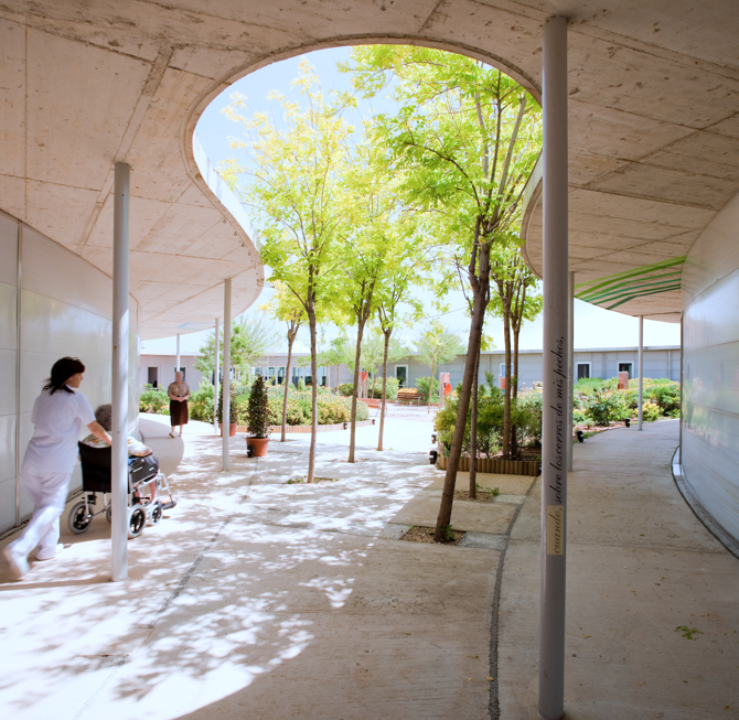Se puede construir un centro geriátrico que no parezca un hospital, sin pasillos, sin barreras arquitectónicas, en una sola planta. En el que todas las habitaciones tengan acceso directo desde, y hacia, un gran jardín-lobby. Además de acceso directo hacia, y desde, las zonas comunes.