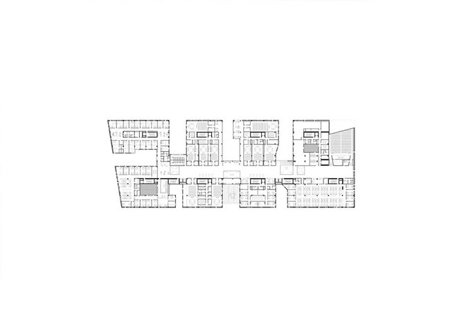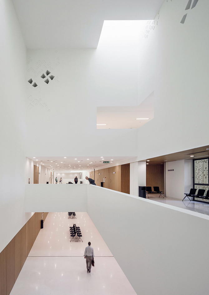 La estrategia de masificación crea integración urbana a través de la fragmentación. El Palacio de Justicia sigue una estrategia similar al proceso de crecimiento espontáneo de las ciudades medievales que da como resultado un volumen cuidadosamente esculpido para adaptarse al contexto circundante.