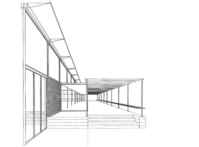 Ambos pabellones cuentan con una cubierta independiente, inclinada hacia el terreno de modo que al combinarse con el trazado de sus respectivos planos de distintas dimensiones, se contrasta claramente esta dualidad, en la intersección de ambos volúmenes. Para reforzar esta dualidad, en la intersección de ambos elementos aparece una perforación o vacío que, actuando como un gran ventanal, selecciona las vistas al mar vistas desde el paseo marítimo.