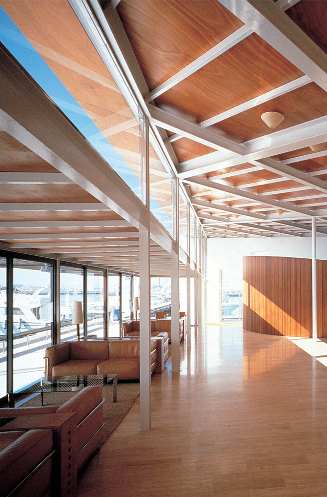 El edificio, ubicado en la esquina de esta plataforma, se organiza en dos pabellones que crean un paseo peatonal a lo largo de la orilla del agua. De estos dos pabellones, el principal, que tiene planta triangular y alberga las oficinas del club, los salones, la pequeña biblioteca náutica y el bar, está orientado al suroeste, orientado hacia las mañanas. Está organizado longitudinalmente y alberga los diferentes servicios relacionados con la navegación.