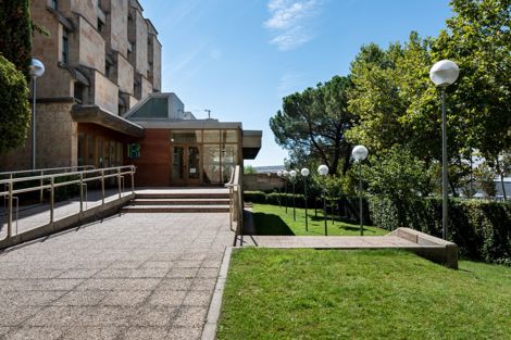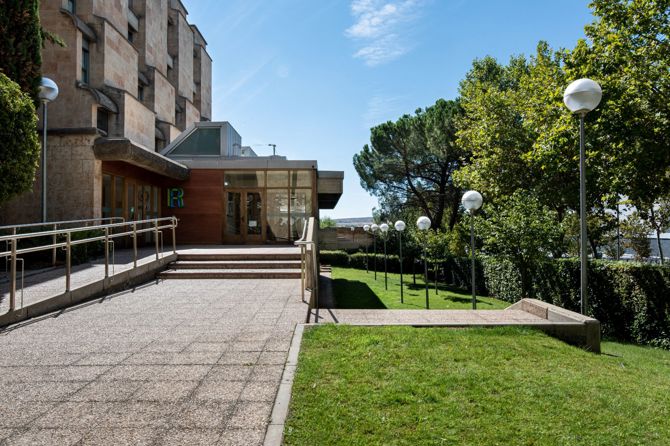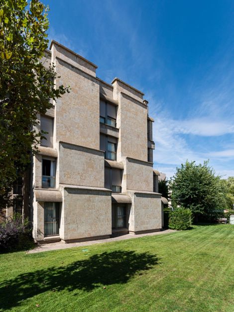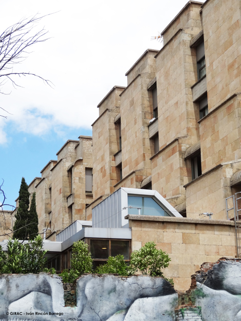 El programa universitario solicitaba dos núcleos para albergar matrimonios de estudiantes jóvenes y estudiantes solteros, con una capacidad de doscientas plazas. Situado en las proximidades de la antigua muralla de la ciudad. El edificio pretende en su imagen externa la idea del recinto amurallado. Las ordenanzas de la zona permitían edificios de ocho plantas, circunstancia que habría eliminado la panorámica histórica del conjunto monumental de la ciudad.