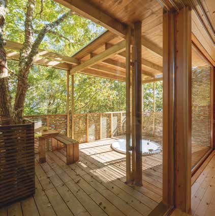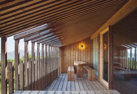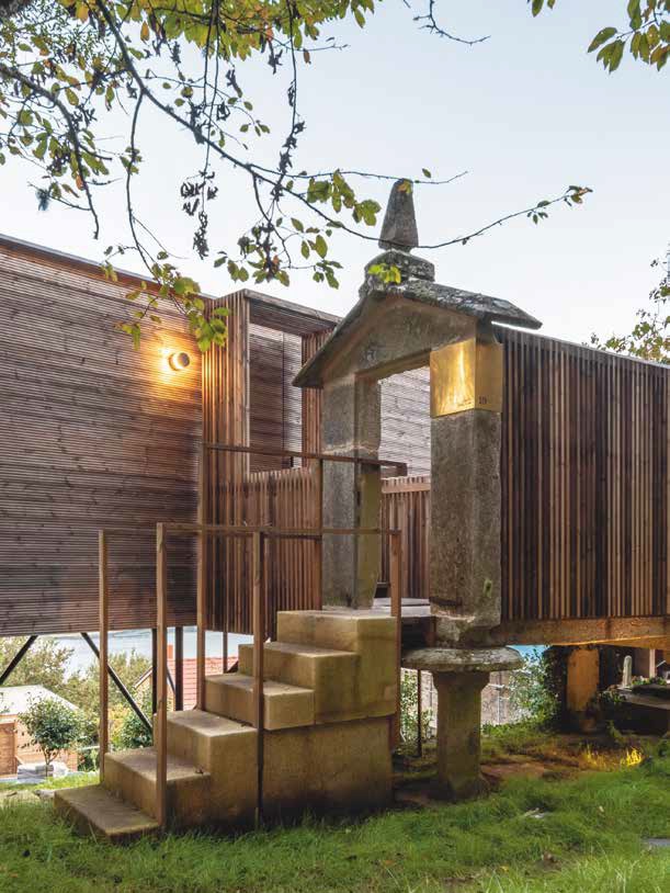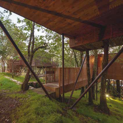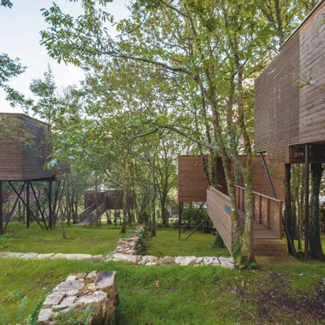 Las ligeras estructuras de madera se apoyan sobre el territorio para salvar las raíces de los árboles, con los que se entremezclan de manera natural. Se borran los límites arbitrarios, y lo natural y lo artificial inician un diálogo que se apoya en el pasado, se asienta en el presente y se proyecta hacia el futuro.