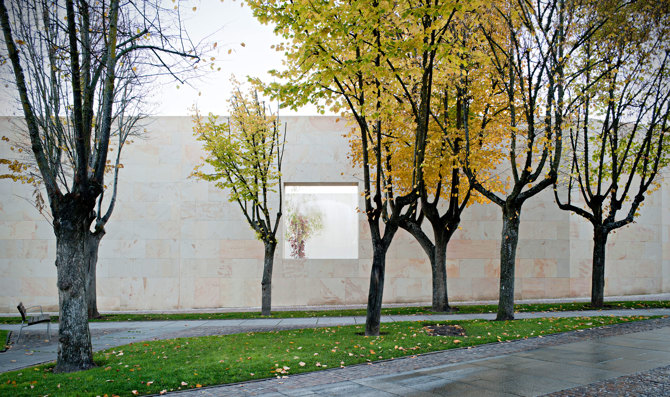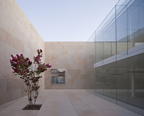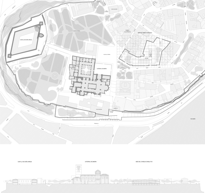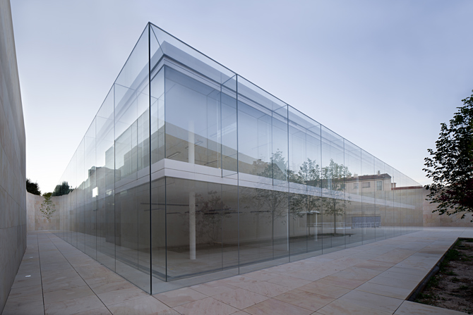 Frente a la catedral, siguiendo las trazas del huerto del antiguo convento, levantamos una fuerte caja de muros de piedra abierta al cielo. Todos los muros y el suelo en piedra. Con la misma piedra que la catedral. Un verdadero Hortus Conclusus. En la esquina que mira a la catedral, una piedra mayor, de 250 x 150 x 50 cm, una verdadera Piedra Angular. Y cincelado en ella: HIC LAPIS ANGULARIS MAIO MMXII POSITO. Dentro de la caja de piedra, una caja de vidrio, toda en vidrio. Como si fuera un invernadero. Con una fachada doble tipo Mure Trombe.